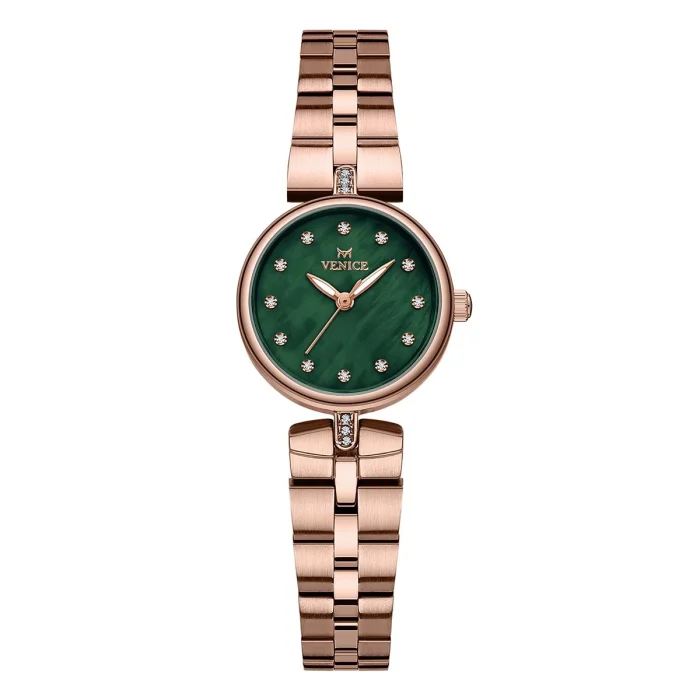 Unveil the allure of true Italian craftsmanship with the Venice V801693701, designed for Women Encased in a captivating Rosegold finish, this watch showcases a Green dial that radiates sophistication. The Metallic strap in Strap Color adds a touch of luxury, making it perfect for any occasion. As a Classic model, its elegance is matched by its exclusivity, underscored by the distinctive Reference Number, V80169